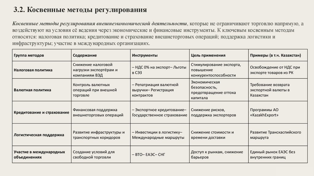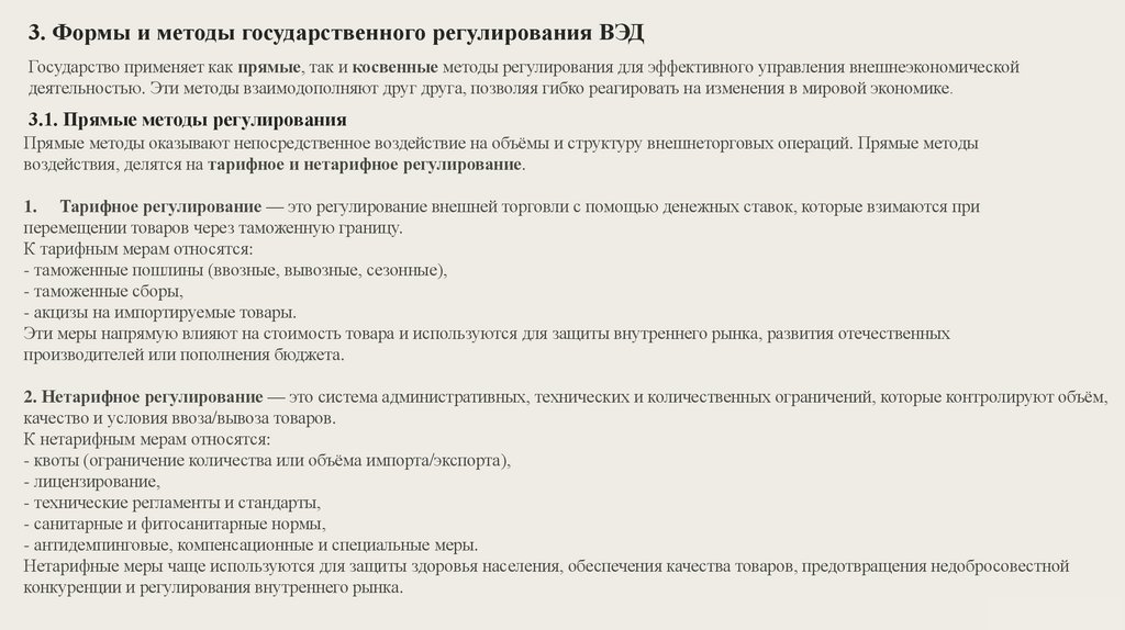 3. Формы и методы государственного регулирования ВЭДГосударство применяет как прямые, так и косвенные методы регулирования для эффективного управления внешнеэкономической