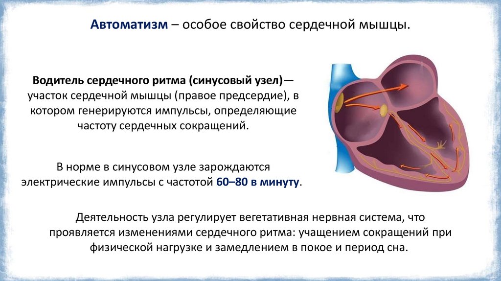 Автоматизм – особое свойство сердечной мышцы.Водитель сердечного ритма (синусовый узел)—