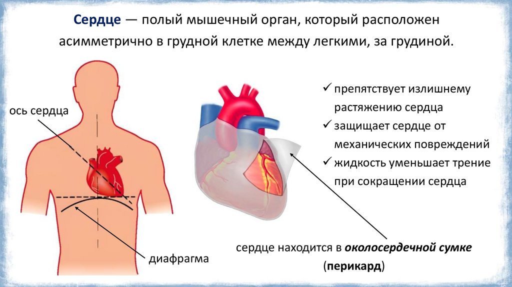 Сердце — полый мышечный орган, который расположенасимметрично в грудной клетке между легкими, за грудиной.