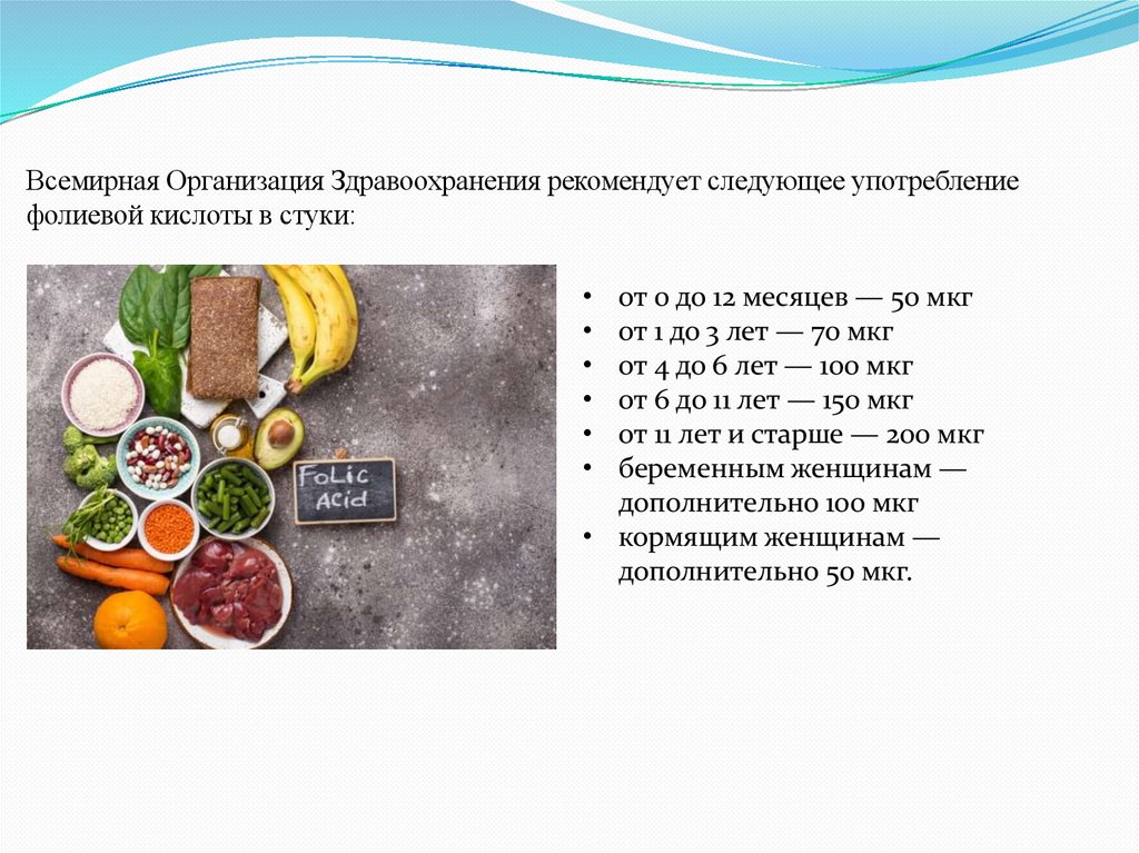 Всемирная Организация Здравоохранения рекомендует следующее употреблениефолиевой кислоты в стуки: