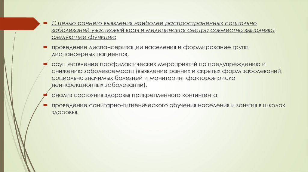 С целью раннего выявления наиболее распространенных социальнозаболеваний участковый врач и медицинская сестра совместно выполняют