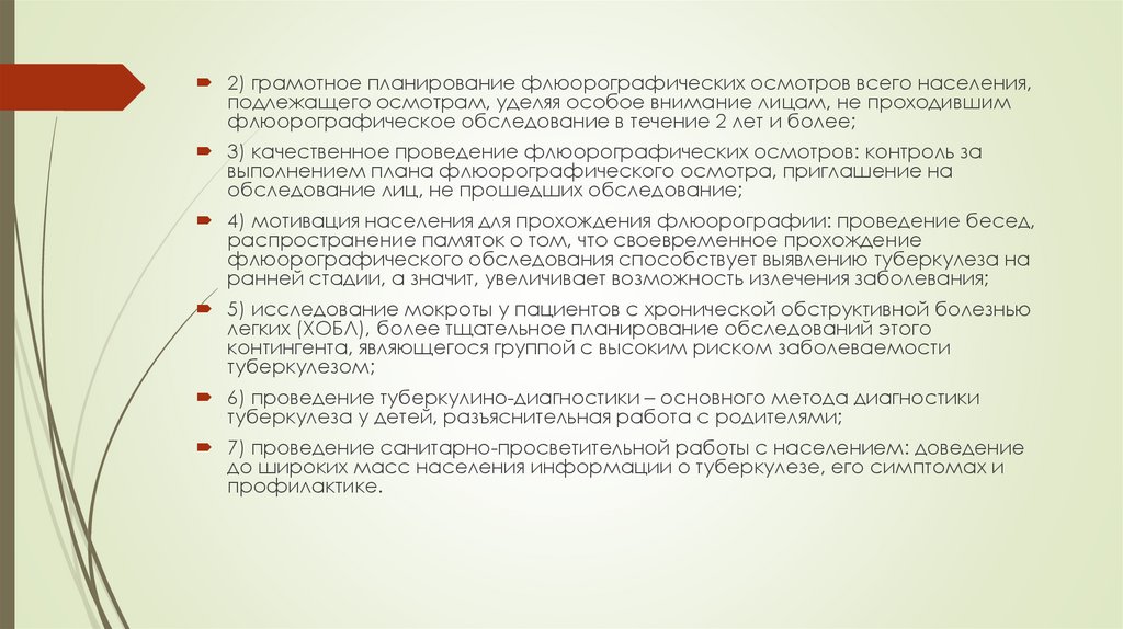2) грамотное планирование флюорографических осмотров всего населения,подлежащего осмотрам, уделяя особое внимание лицам, не проходившим