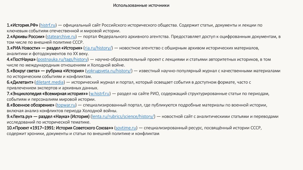 Использованные источники1.«История.РФ» (histrf.ru) — официальный сайт Российского исторического общества. Содержит статьи, документы и лекции по