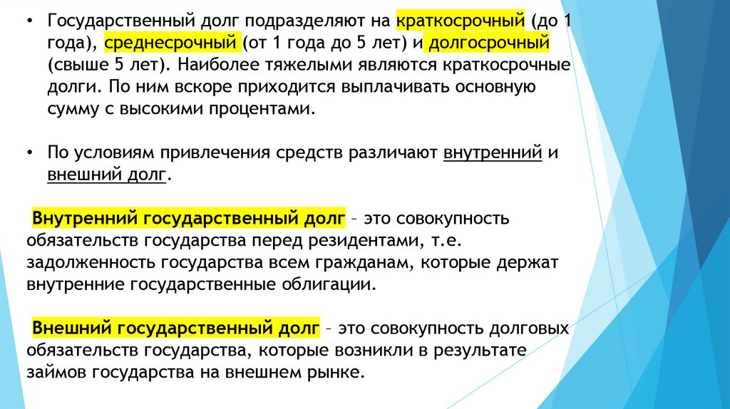 • Государственный долг подразделяют на краткосрочный (до 1года), среднесрочный (от 1 года до 5 лет) и долгосрочный