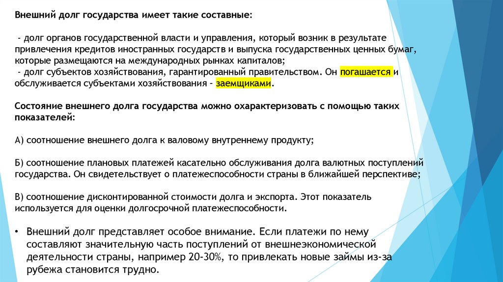 Состояние внешнего долга государства можно охарактеризовать с помощью таких