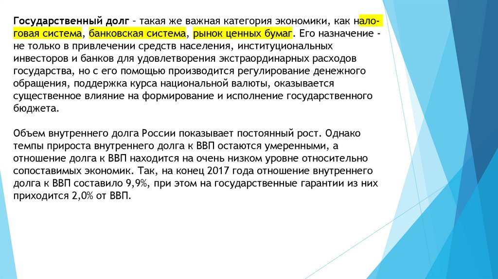 Государственный долг – такая же важная категория экономики, как налоговая система, банковская система, рынок ценных бумаг. Его назначение не только в привлечении средств населения, институциональныхинвесторов и банков для удовлетворения экстраординарных расходов