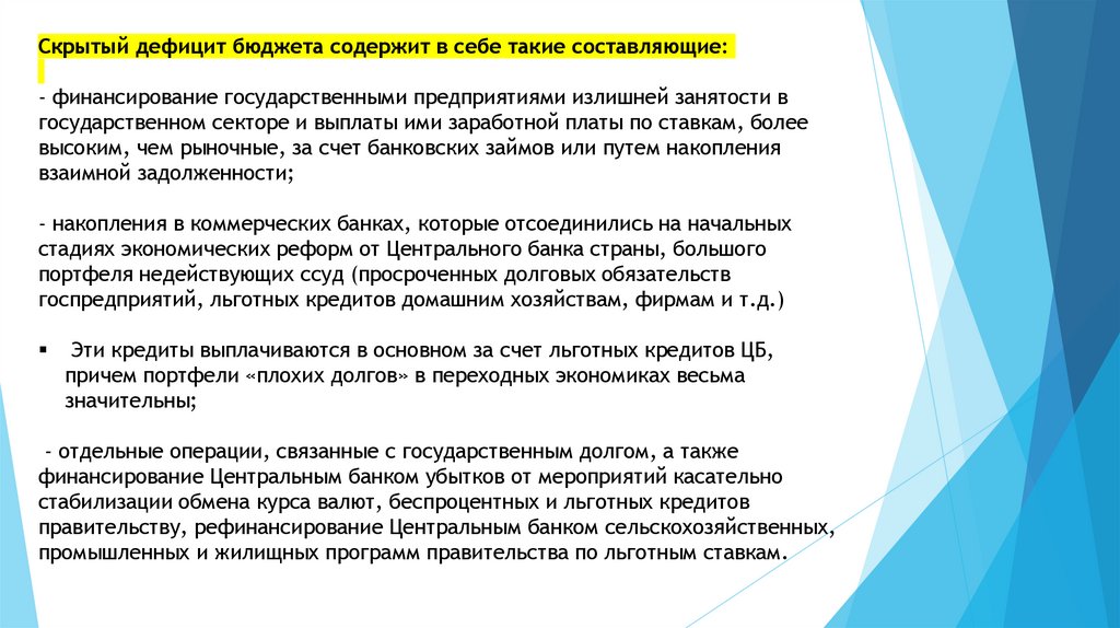 Скрытый дефицит бюджета содержит в себе такие составляющие:- финансирование государственными предприятиями излишней занятости в