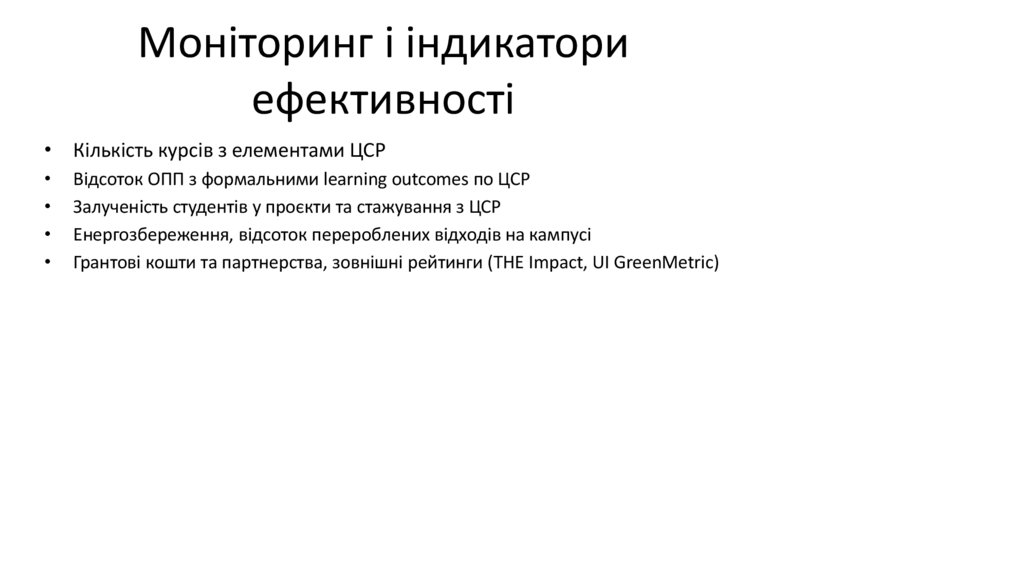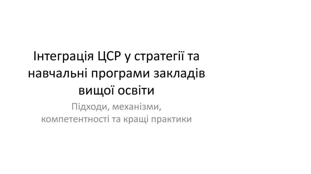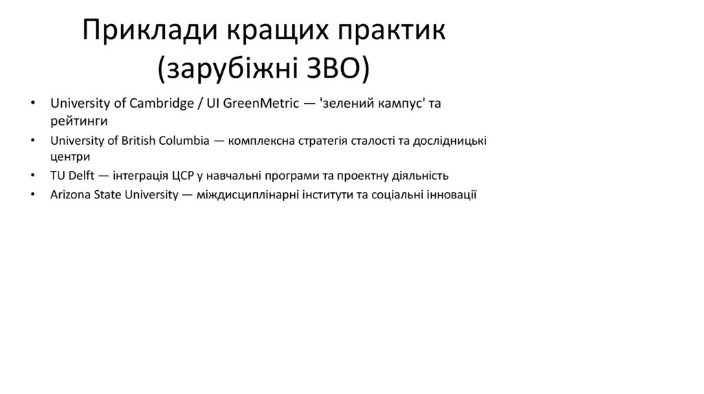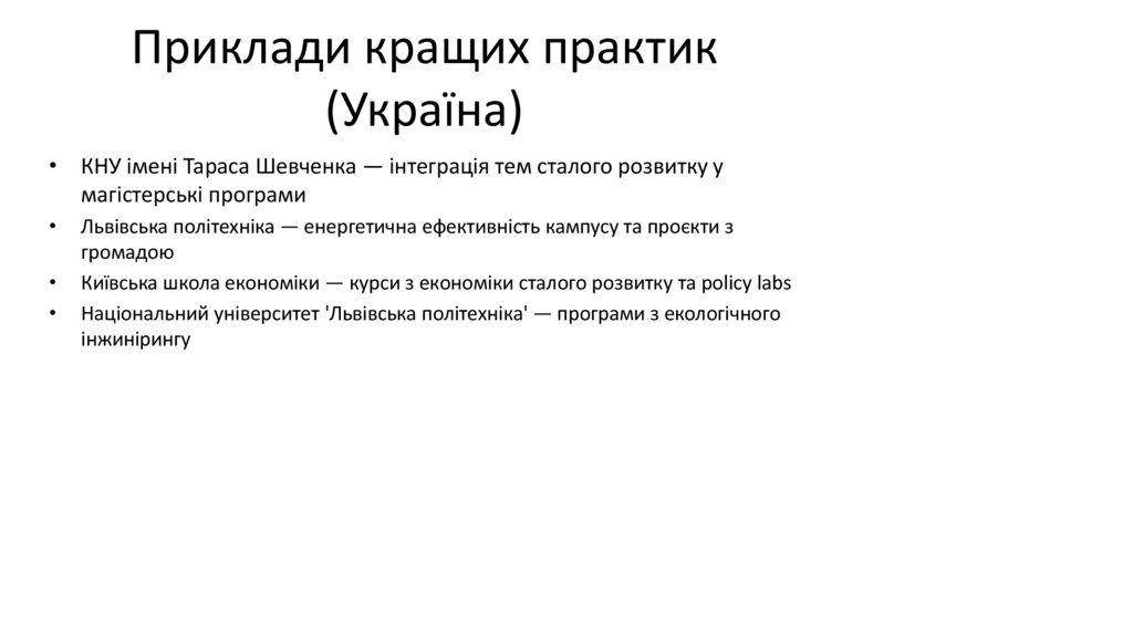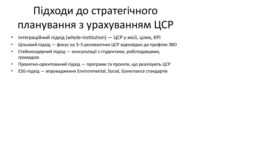 • Інтеграційний підхід (whole-institution) — ЦСР у місії, цілях, KPI