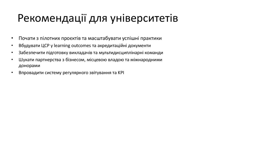 Рекомендації для університетів• Почати з пілотних проєктів та масштабувати успішні практики