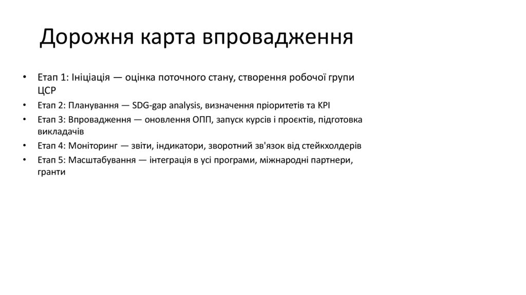 Дорожня карта впровадження• Етап 1: Ініціація — оцінка поточного стану, створення робочої групи