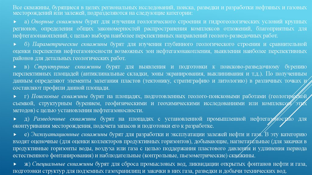 Все скважины, бурящиеся в целях региональных исследований, поиска, разведки и разработки нефтяных и газовыхместорождений или залежей, подразделяются на следующие категории: