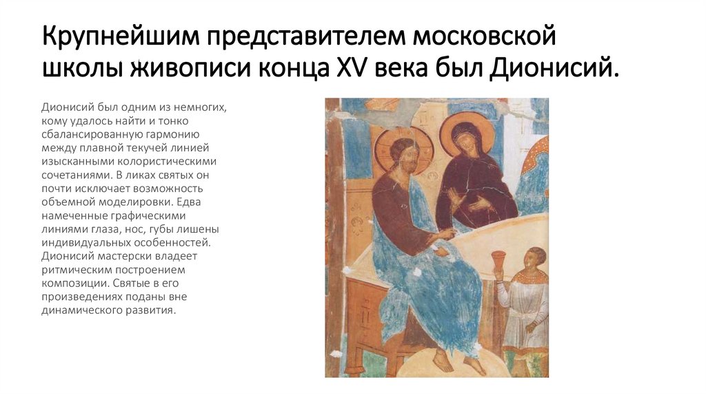 Крупнейшим представителем московскойшколы живописи конца XV века был Дионисий.