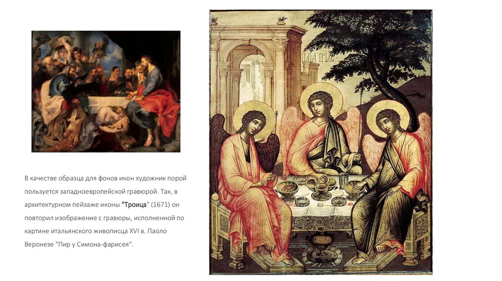 В качестве образца для фонов икон художник поройпользуется западноевропейской гравюрой. Так, в