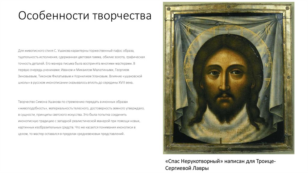 Особенности творчестваДля живописного стиля С. Ушакова характерны торжественный пафос образа,