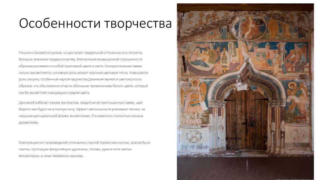 Дионисий избегает резких контрастов, предпочитая приглушенную гамму, цвет