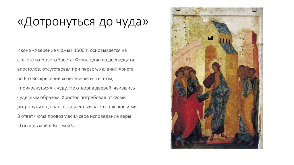 «Дотронуться до чуда»Икона «Уверение Фомы» 1500 г. основывается на