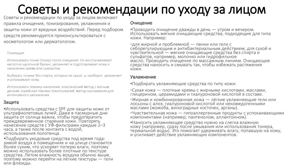 Советы и рекомендации по уходу за лицомСоветы и рекомендации по уходу за лицом включают