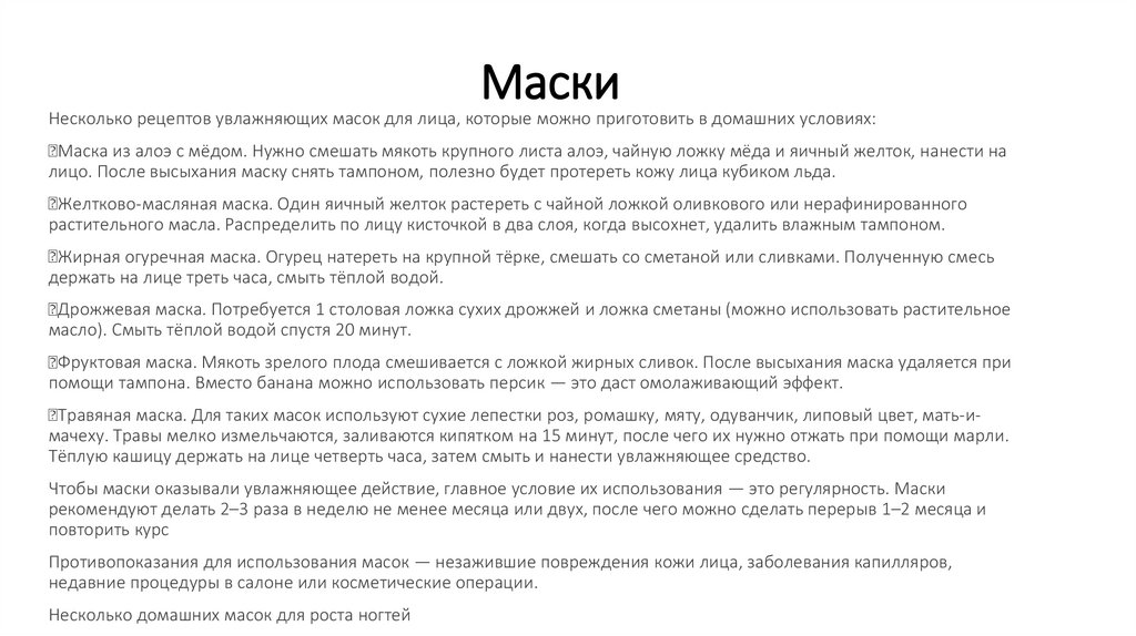 МаскиНесколько рецептов увлажняющих масок для лица, которые можно приготовить в домашних условиях: