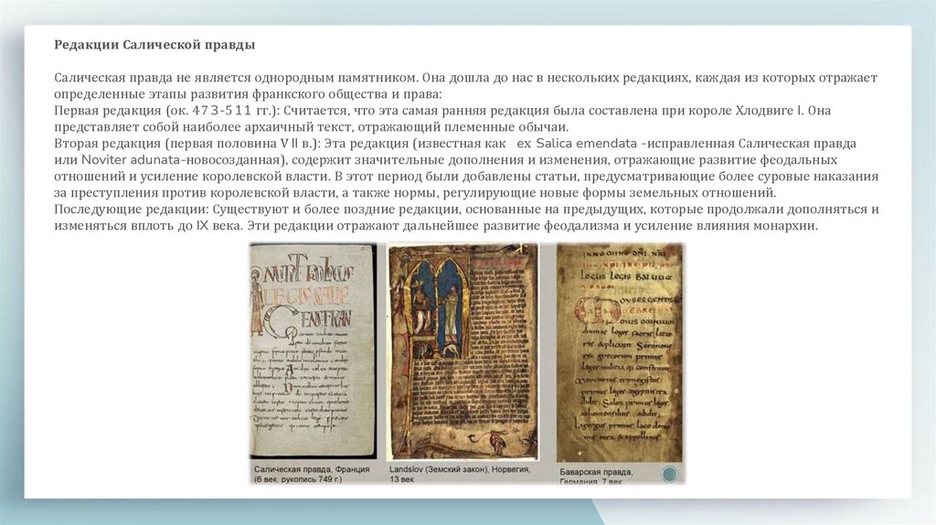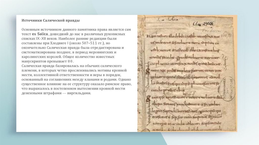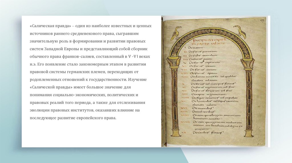 «Салическая правда» – один из наиболее известных и ценныхисточников раннего средневекового права, сыгравшим