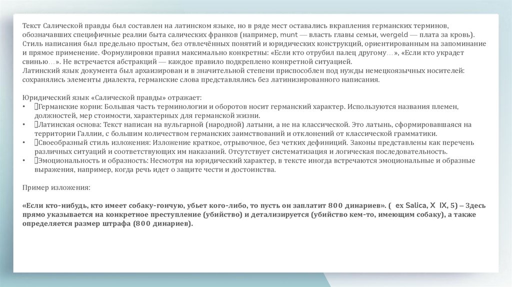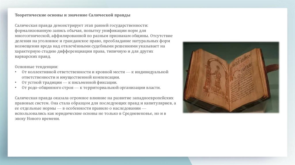 Теоретические основы и значение Салической правдыСалическая правда демонстрирует этап ранней государственности: