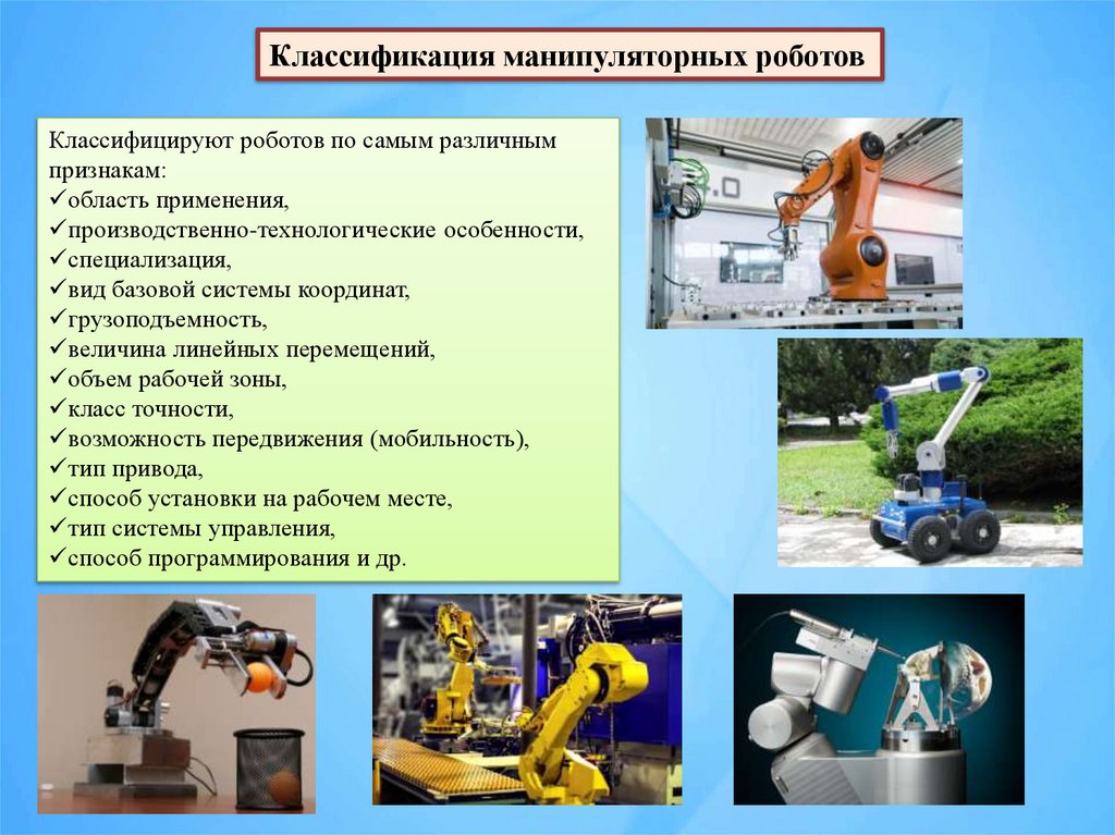 Классификация манипуляторных роботовКлассифицируют роботов по самым различным