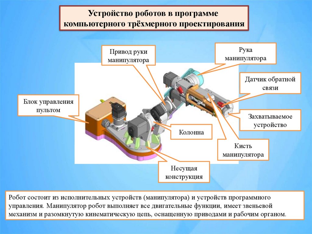 Робот состоит из исполнительных устройств (манипулятора) и устройств программного