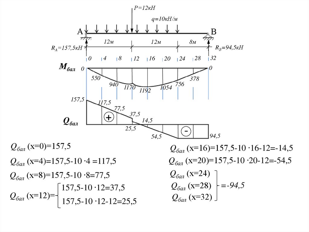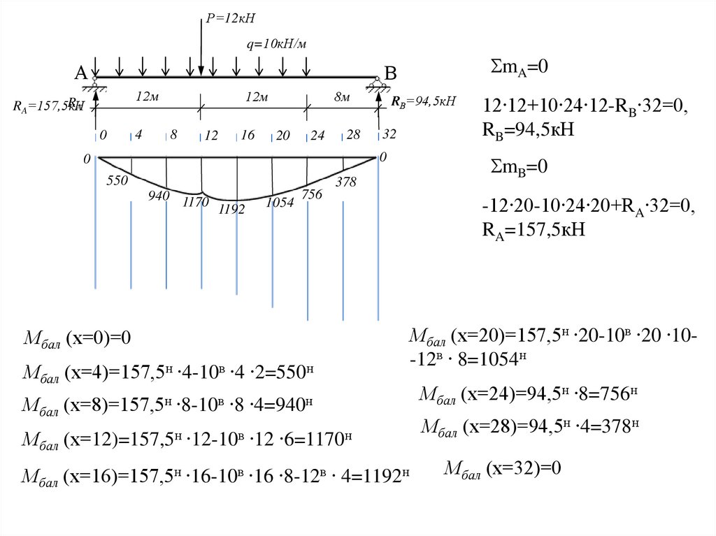 Мбал (х=16)=157,5н ∙16-10в ∙16 ∙8-12в ∙ 4=1192н