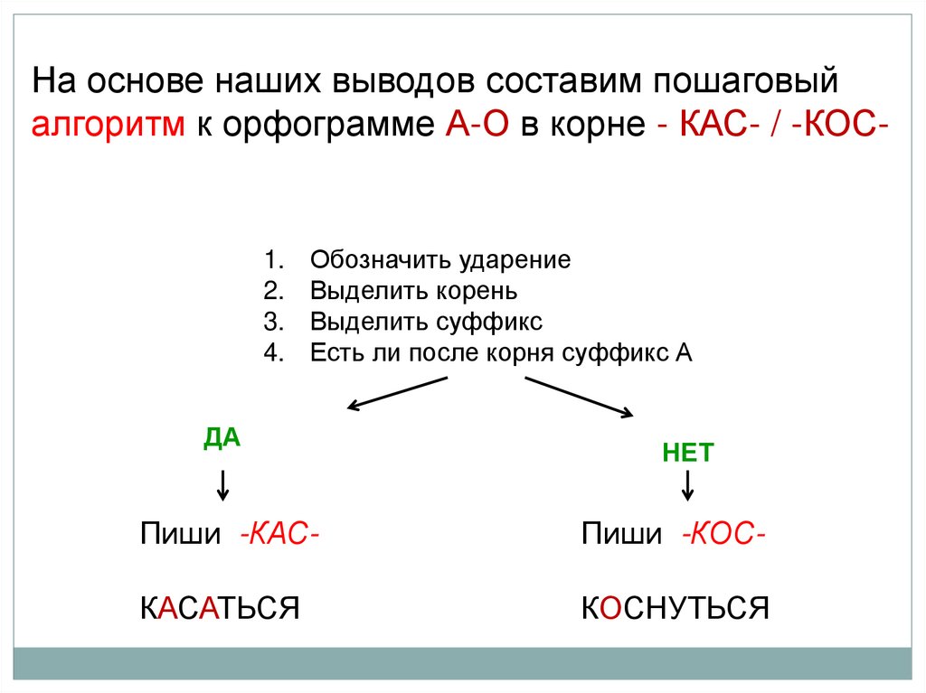 На основе наших выводов составим пошаговыйалгоритм к орфограмме А-О в корне - КАС- / -КОС-