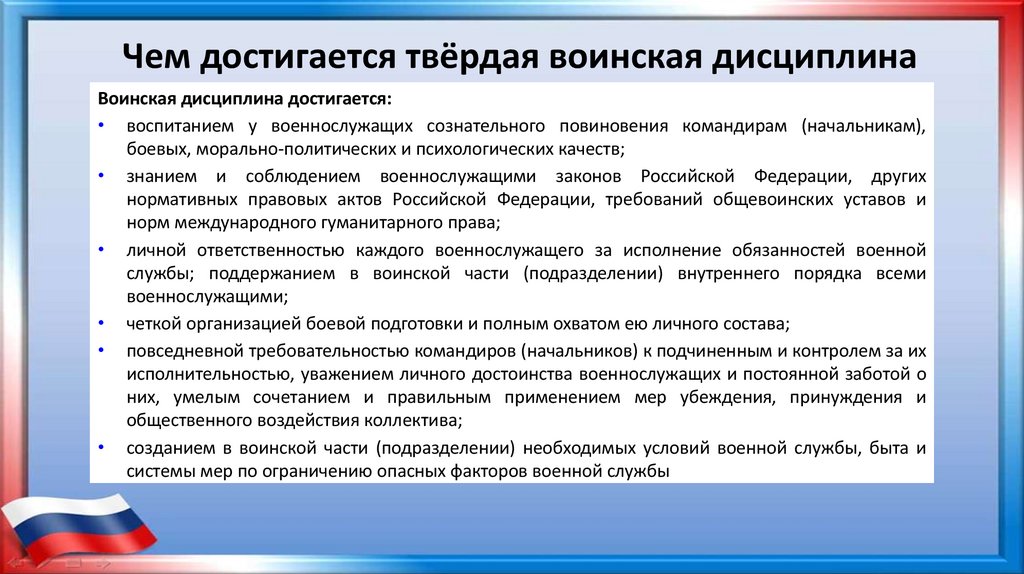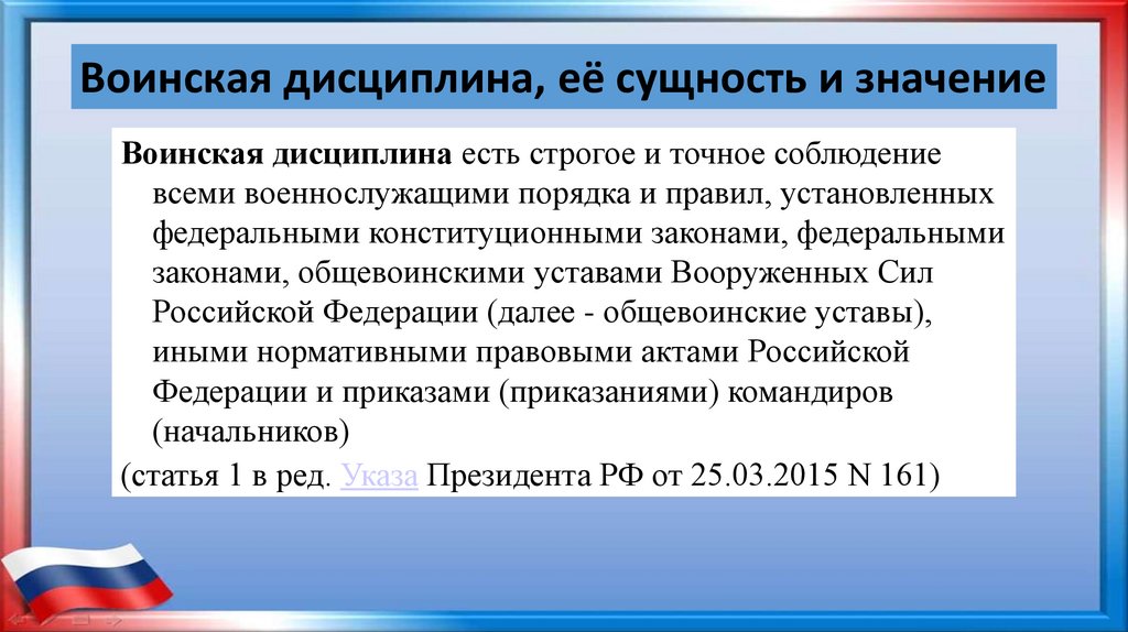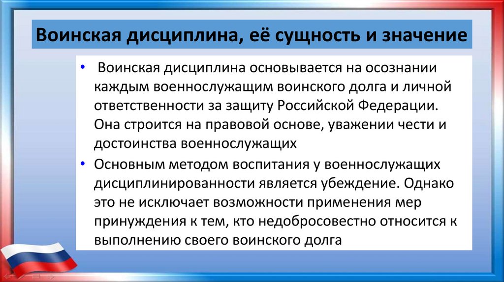 Воинская дисциплина, её сущность и значение• Воинская дисциплина основывается на осознании