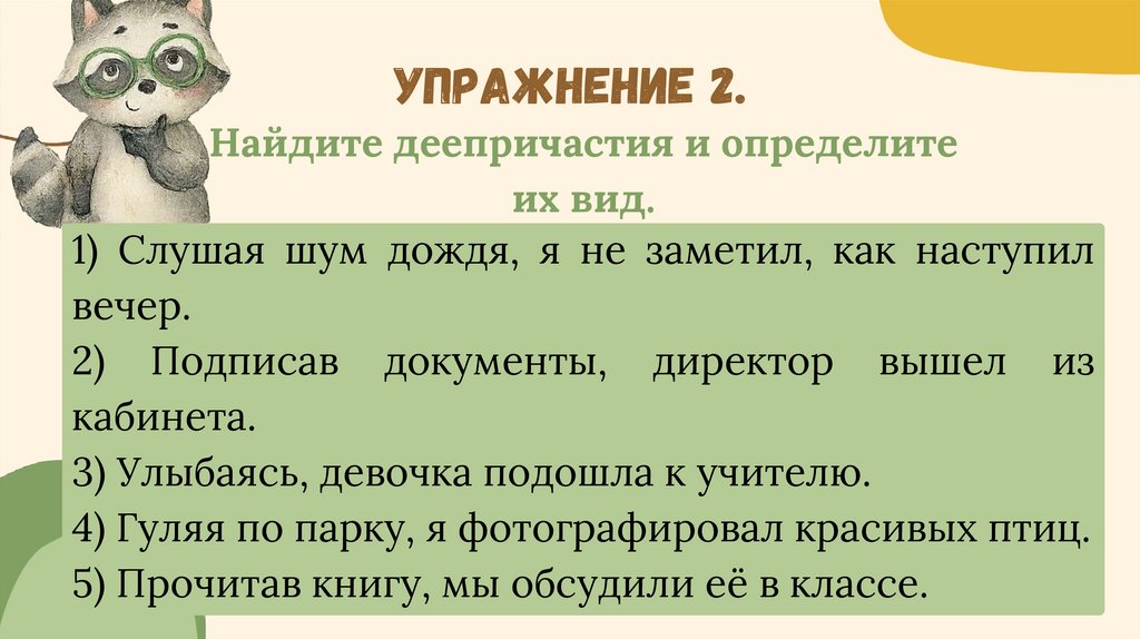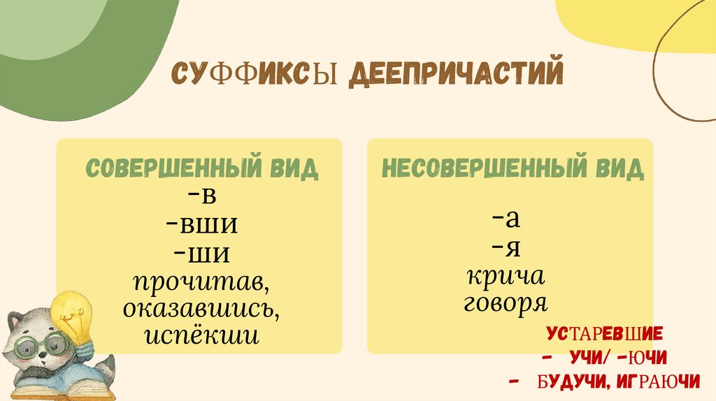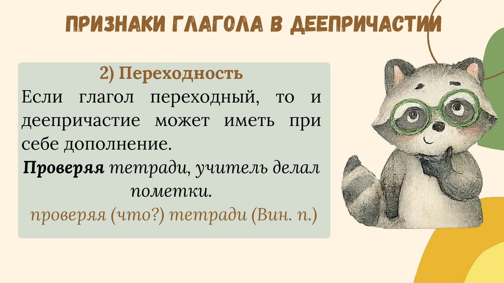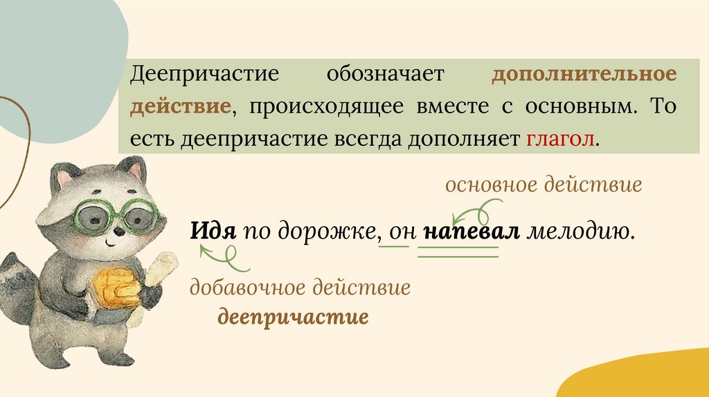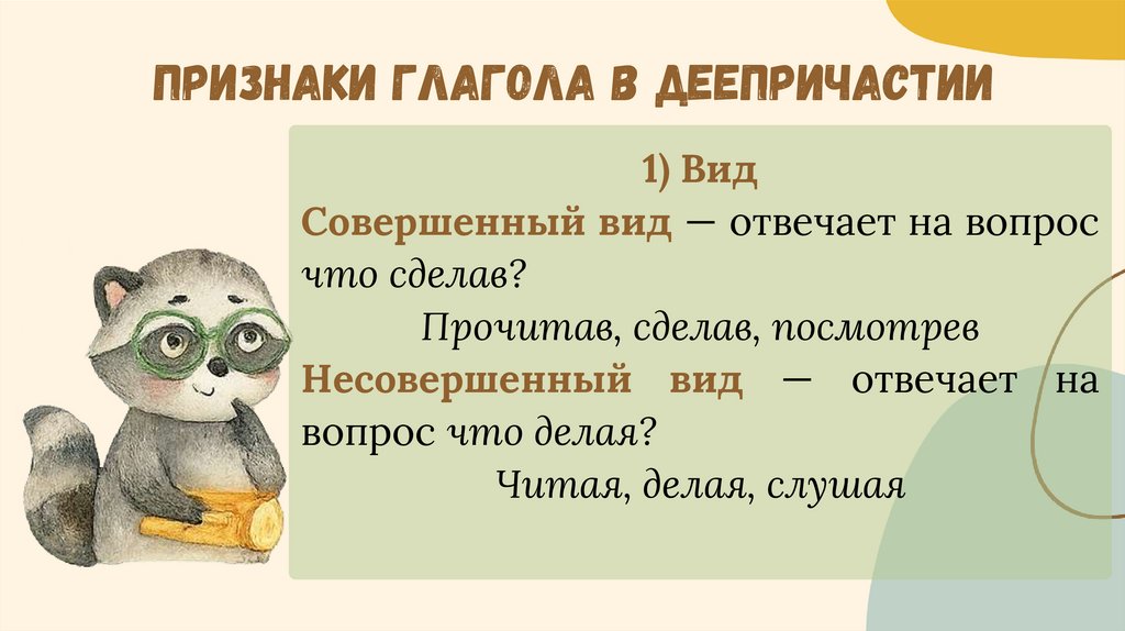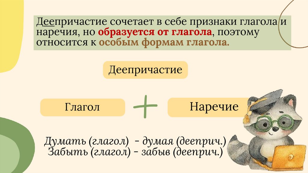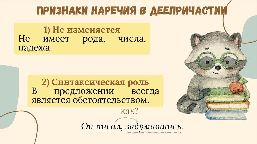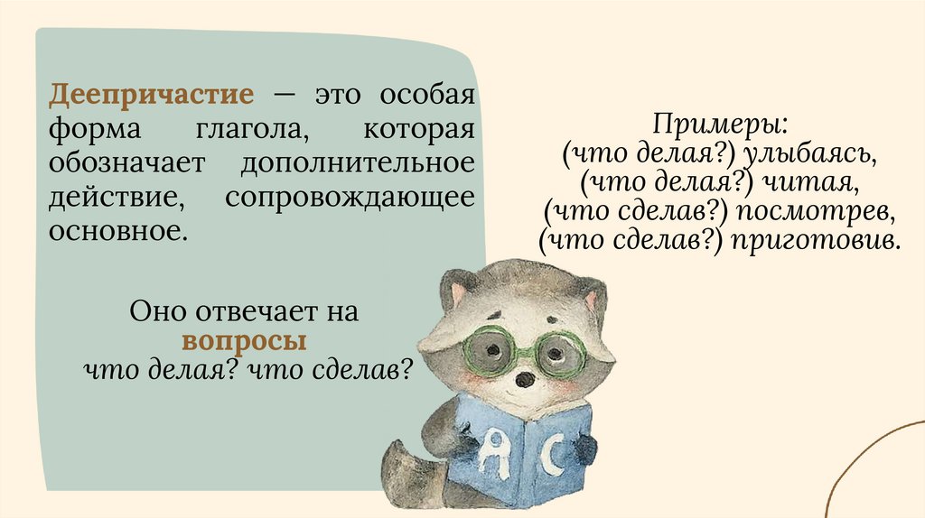 Деепричастие сочетает в себе признаки глагола инаречия, но образуется от глагола, поэтому