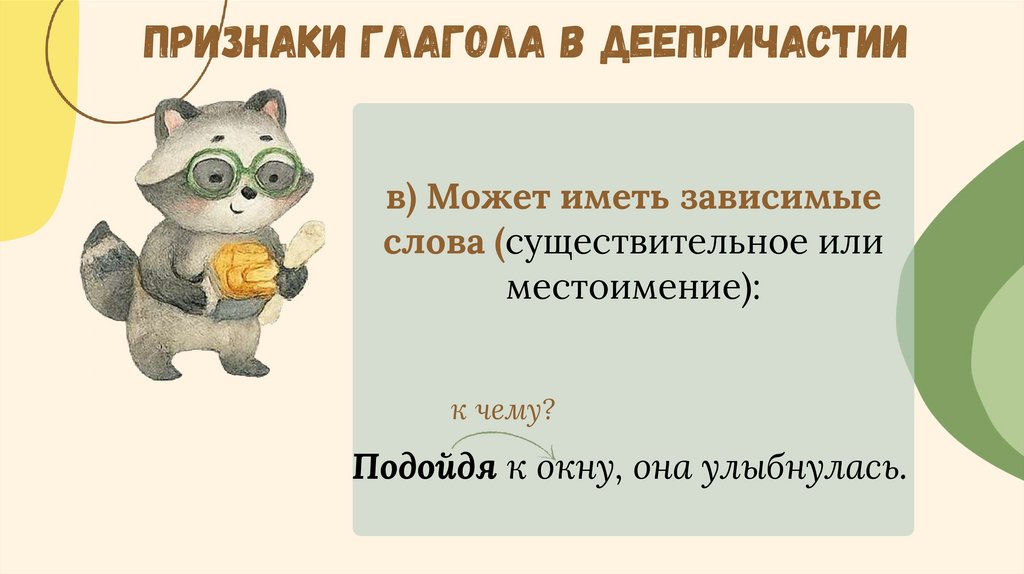 Признаки глагола в деепричастиив) Может иметь зависимые