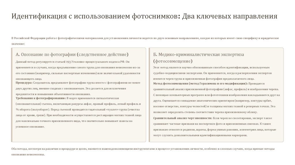 Идентификация с использованием фотоснимков: Два ключевых направленияВ Российской Федерации работа с фотографическими материалами для установления личности ведется по двум основным направлениям, каждое из которых имеет свою специфику и юридическое