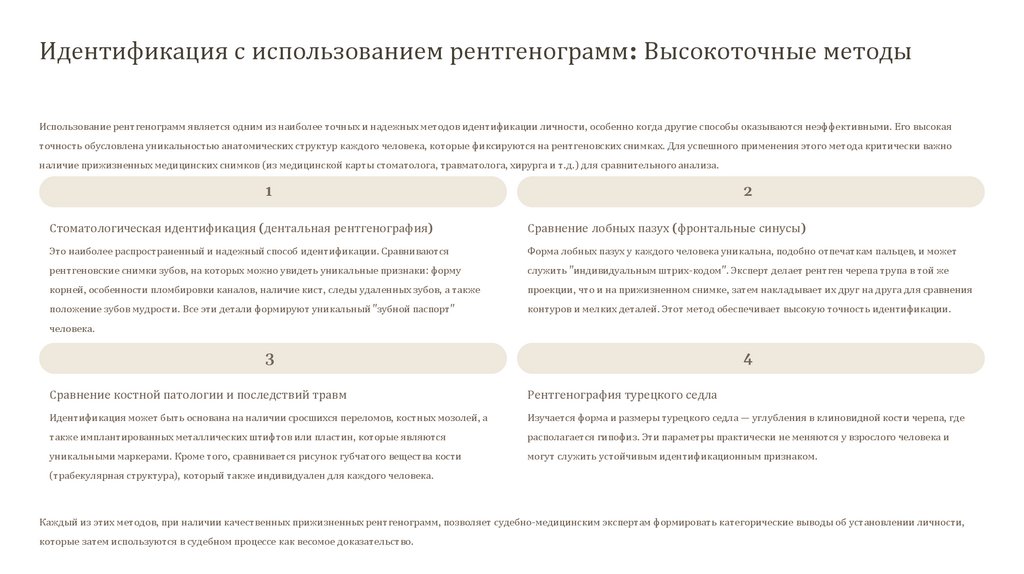 Идентификация с использованием рентгенограмм: Высокоточные методыИспользование рентгенограмм является одним из наиболее точных и надежных методов идентификации личности, особенно когда другие способы оказываются неэффективными. Его высокая