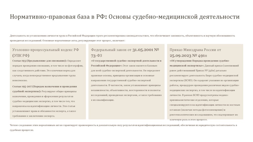 Нормативно-правовая база в РФ: Основы судебно-медицинской деятельностиДеятельность по установлению личности трупа в Российской Федерации строго регламентирована законодательством, что обеспечивает законность, объективность и научную обоснованность