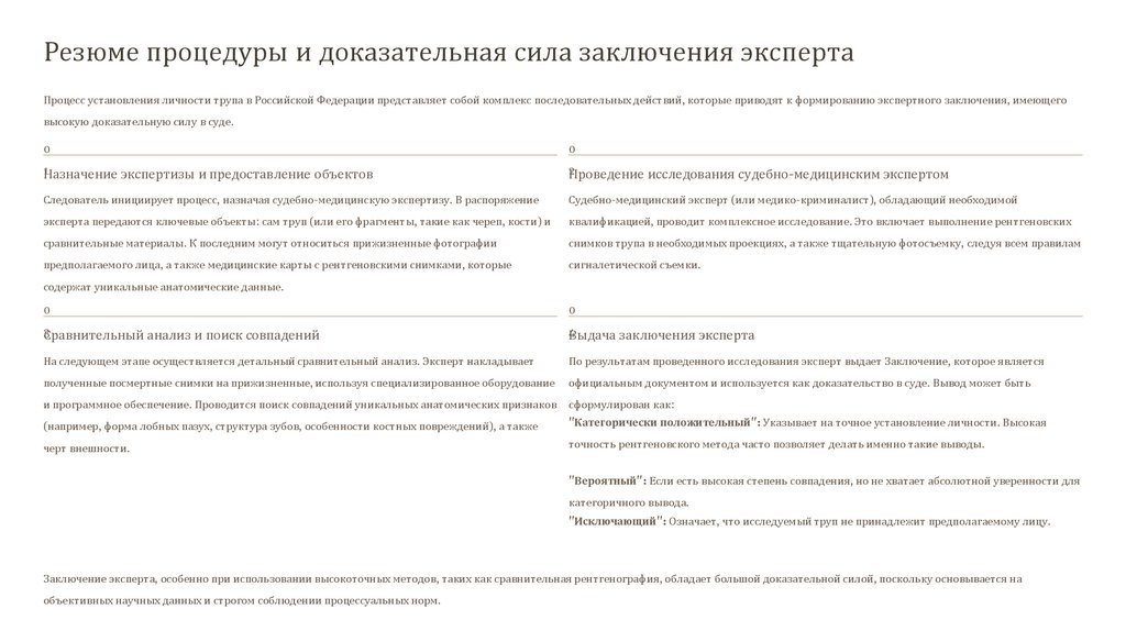 Резюме процедуры и доказательная сила заключения экспертаПроцесс установления личности трупа в Российской Федерации представляет собой комплекс последовательных действий, которые приводят к формированию экспертного заключения, имеющего