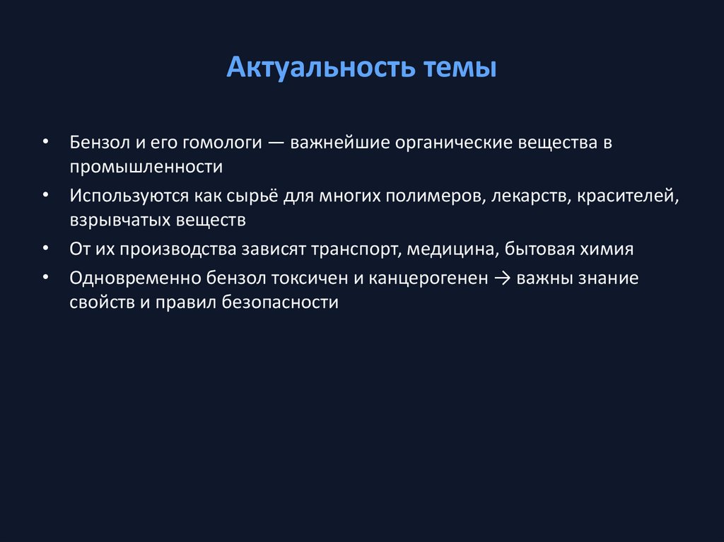 Актуальность темы• Бензол и его гомологи — важнейшие органические вещества в