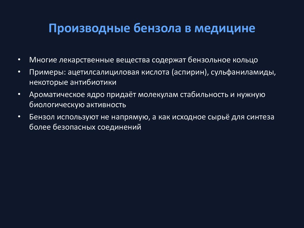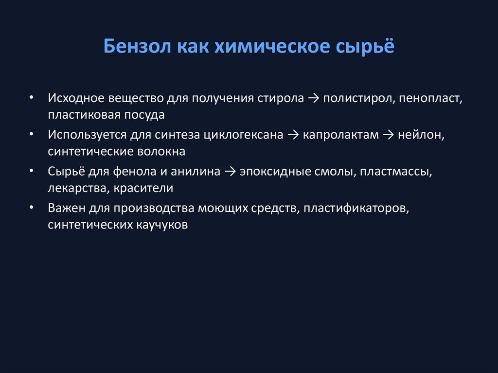 • Бензол используют не напрямую, а как исходное сырьё для синтеза