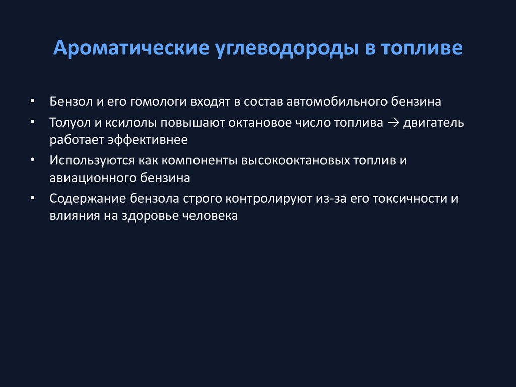 Ароматические углеводороды в топливе• Бензол и его гомологи входят в состав автомобильного бензина
