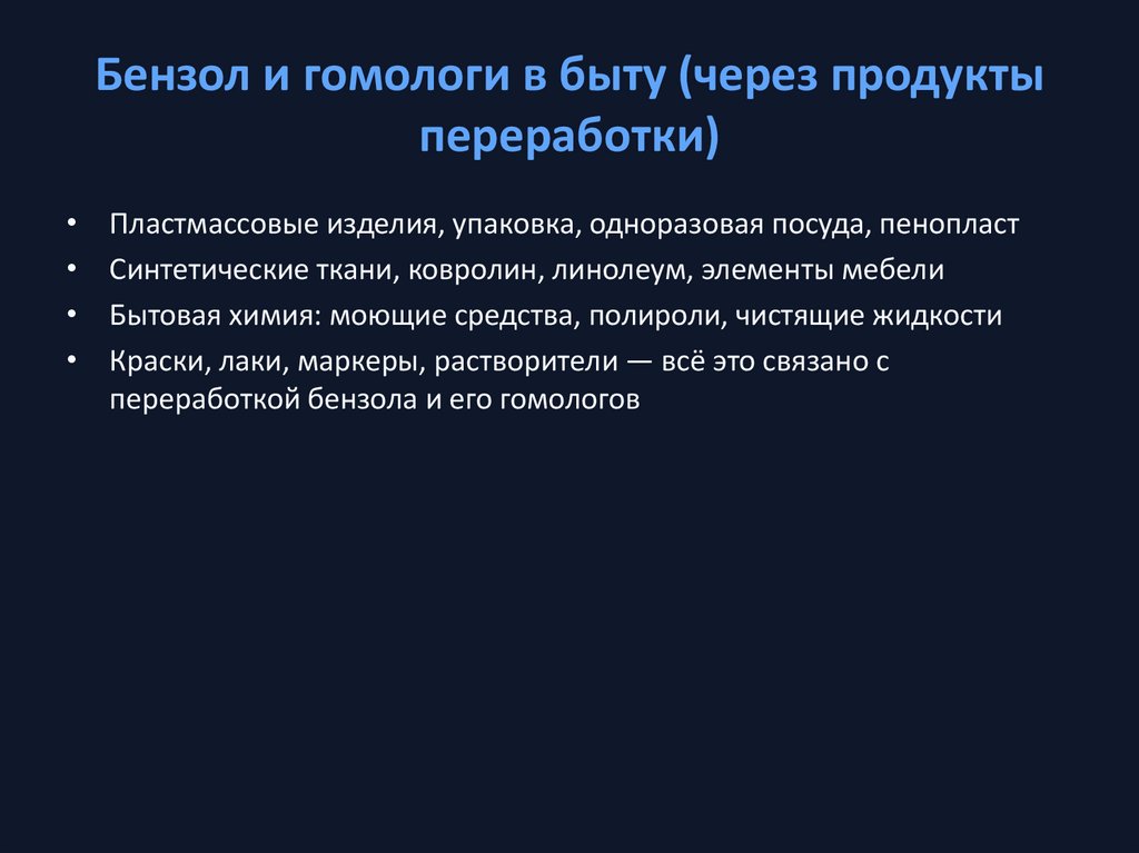 • Одновременно бензол токсичен и канцерогенен → важны знание