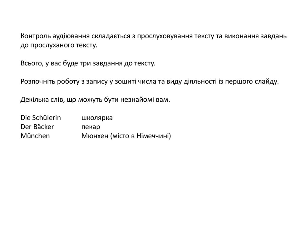 Контроль аудіювання складається з прослуховування тексту та виконання завданьдо прослуханого тексту.