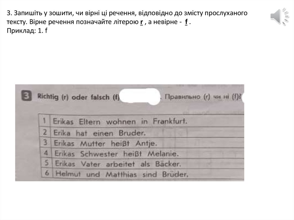 3. Запишіть у зошити, чи вірні ці речення, відповідно до змісту прослуханоготексту. Вірне речення позначайте літерою r , а невірне - f .