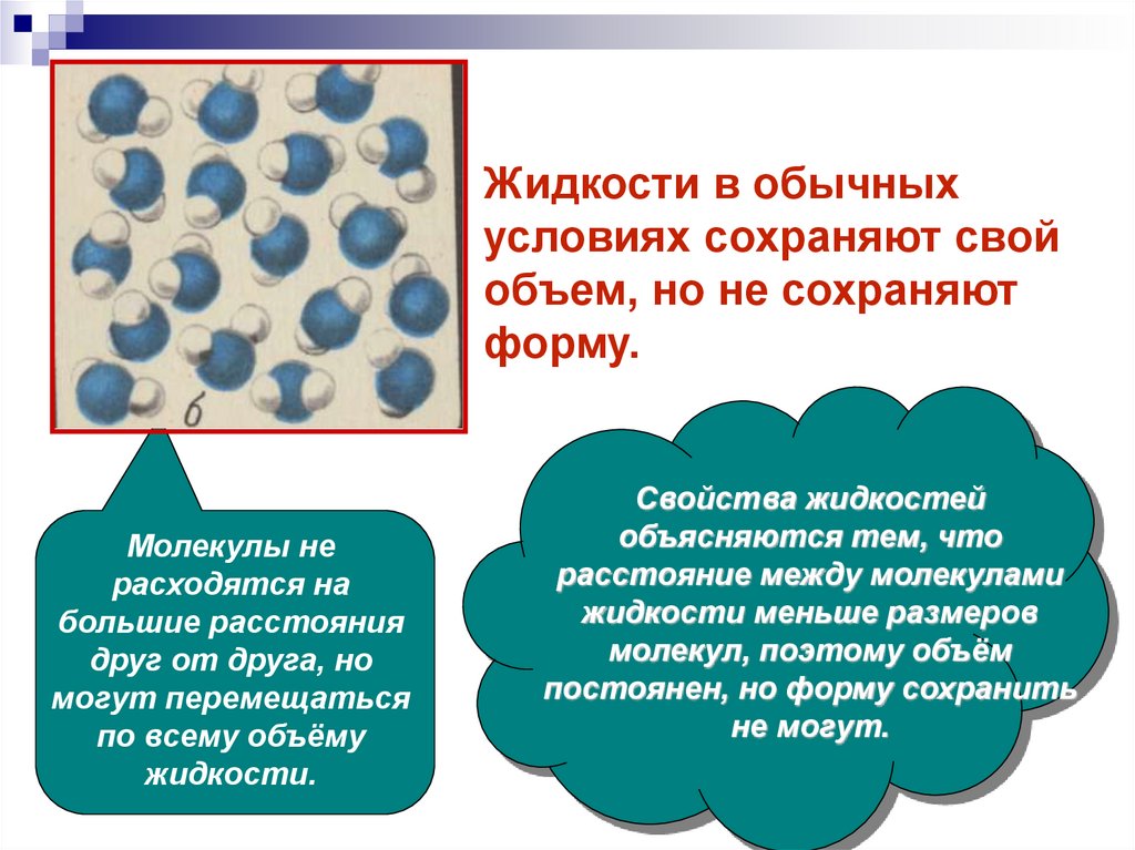 Молекулы жидкости расположеныпочти вплотную друг к другу.
