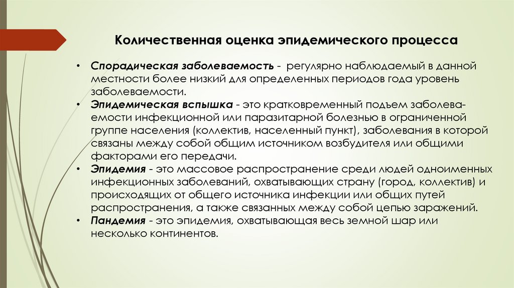 • Эпидемическая вспышка - это кратковременный подъем заболеваемости инфекционной или паразитарной болезнью в ограниченной