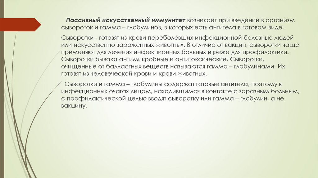Пассивный искусственный иммунитет возникает при введении в организмсывороток и гамма – глобулинов, в которых есть антитела в готовом виде.