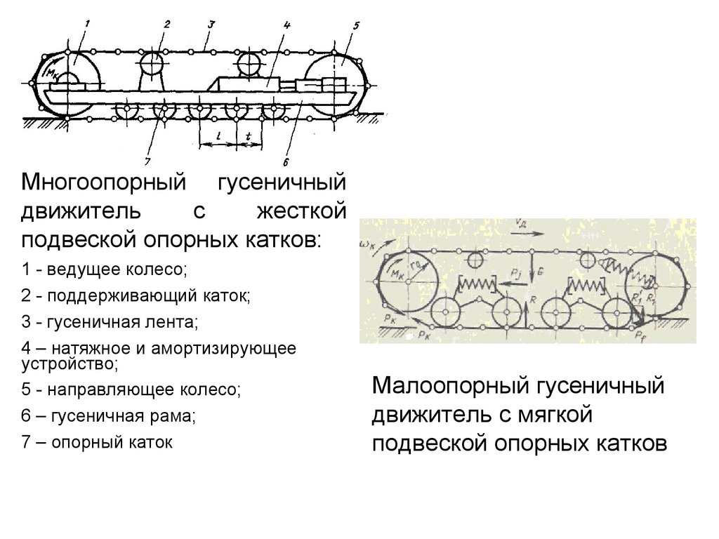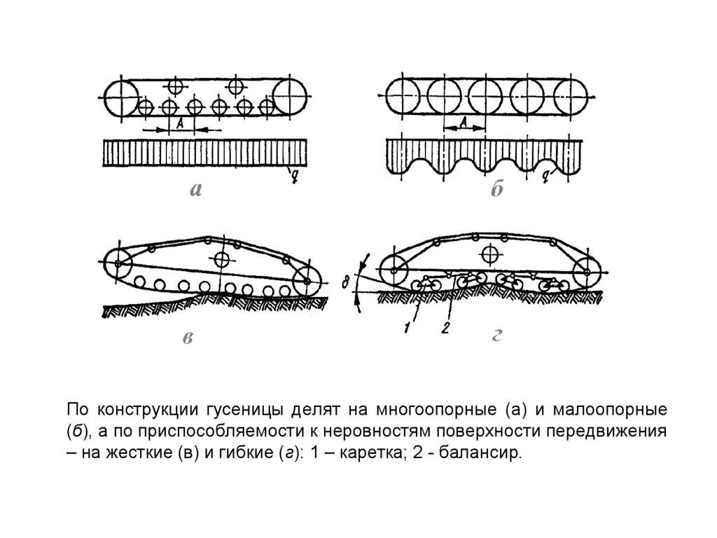 По конструкции гусеницы делят на многоопорные (а) и малоопорные(б), а по приспособляемости к неровностям поверхности передвижения