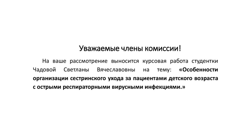 Уважаемые члены комиссии!На ваше рассмотрение выносится курсовая работа студентки
