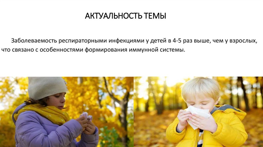 АКТУАЛЬНОСТЬ ТЕМЫЗаболеваемость респираторными инфекциями у детей в 4-5 раз выше, чем у взрослых,