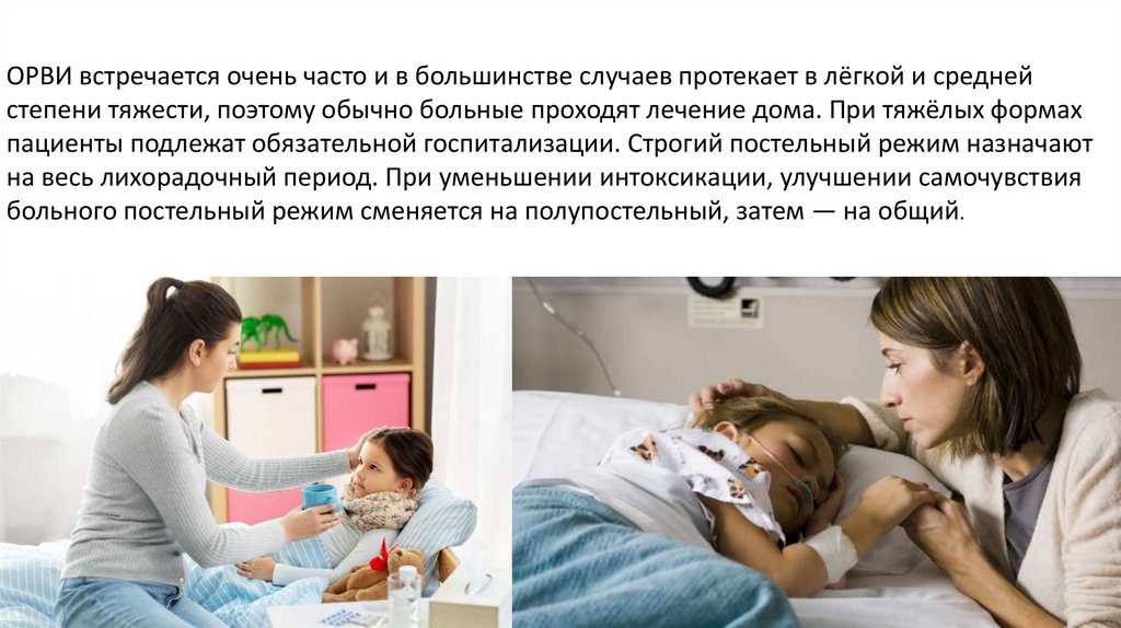 ОРВИ встречается очень часто и в большинстве случаев протекает в лёгкой и среднейстепени тяжести, поэтому обычно больные проходят лечение дома. При тяжёлых формах