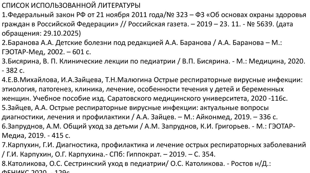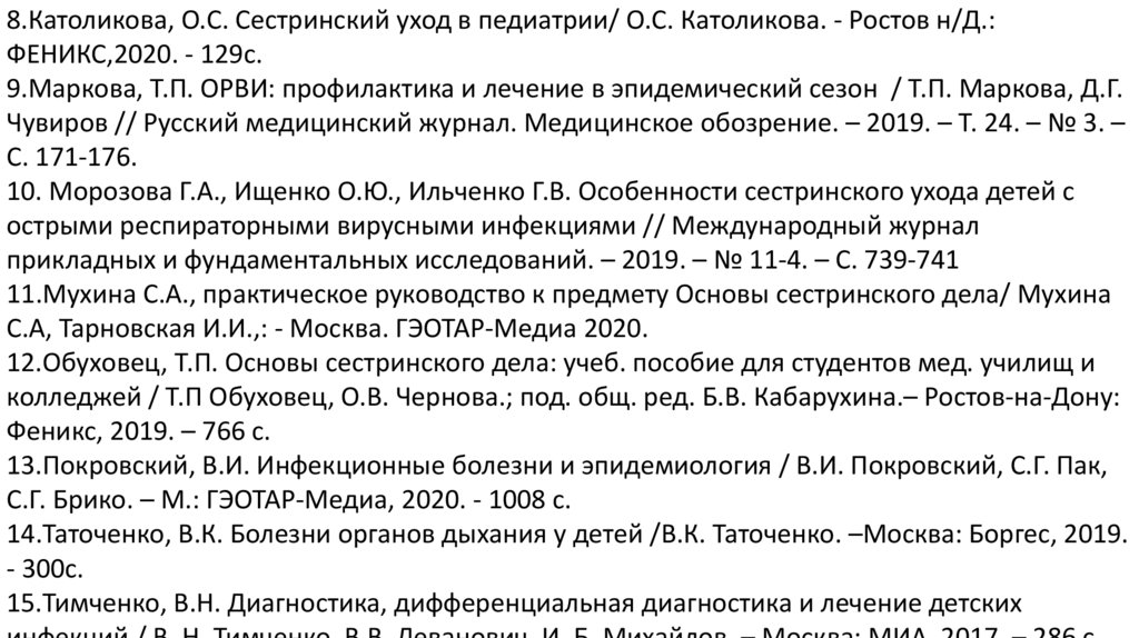 8.Католикова, О.С. Сестринский уход в педиатрии/ О.С. Католикова. - Ростов н/Д.:ФЕНИКС,2020. - 129с.