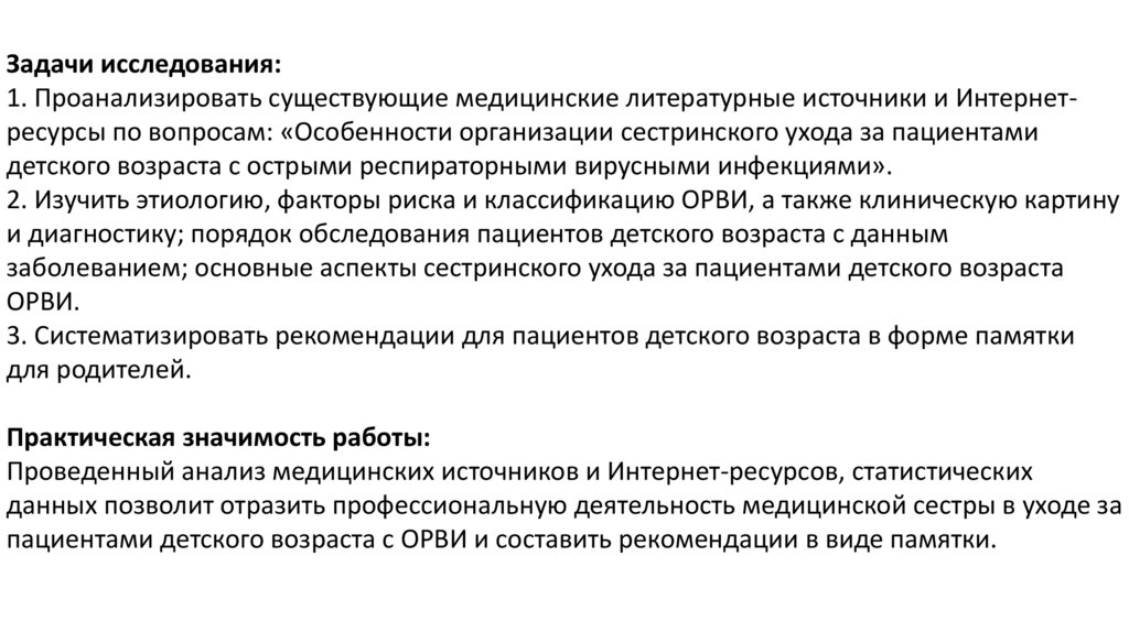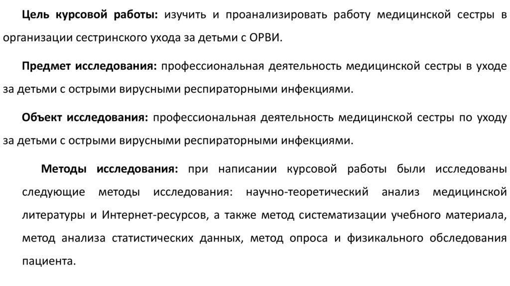 Цель курсовой работы: изучить и проанализировать работу медицинской сестры ворганизации сестринского ухода за детьми с ОРВИ.